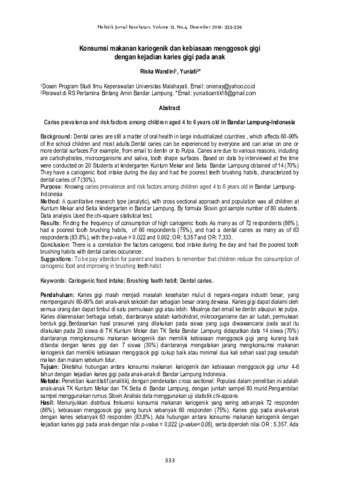 Riska Wandini and Yuniati (2019) Konsumsi makanan kariogenik dan kebiasaan menggosok gigi dengan kejadian karies gigi pada anak. Holistik: Jurnal Kesehatan, 13 (4): 9. pp. 333-339. ISSN 1978-3337