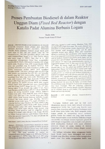 Proses pembuatan biodiesel dengan katalis padat sudah mulai di teliti oleh para peneliti antara lain oleh Schuchard et al., 1997,1998 (guanidine) sebagai katalis pada reaksi transesterifikasi, Suppes et al., 2000 (CaCO3) dengan suhu reaksi tinggi (> 220°℃). Fang Chai et al., 2007 menggunakan heteropolyacid, Rohm Haas mengguanakan amberlist BD 20, Wei Z., 2008 membuat cangkang telur sebagai katalis padat, Masakazu Toda, 2005 mengembangkan katalis padat dari gula. Hasil yang di dapatkan bervariasi. Hasil penelitian Schuchard et al. masih mempunyai problem yaitu mereka menemukan aktifitas katalis mulai mengalami kerusakan setelah 1 jam reaksi, sehingga reaksi yang dihasilkan tidak komplit dan pemisahan fase jadi lebih sulit Sedangkan peneliti yang lain (sda) menyimpulkan dengan reaksi solidesterifikasi biaya bahan baku lebih rendah, fleksibilitas prosesnaik, yield biodiesel lebih tinggi, kemurnian biodiesel dangliserol lebih tinggi dan prosesnya lebih aman dan sederhana. Pada penelitian ini peneliti mencoba katalis padat alumina berbasis logam untuk digunakan pada reaksi transesterifikasi pada suhu antara 55-65°C, dengan laju alir < 150 x 10° l/jam, panjang reaktor 30 cm, diameter pipa reaktor 2,5 em. Pelarut yang digunakan adalah methanol (30% dari volume trigliserida). Reaktor di pasang horizontal dengan pemanas dilakukan didalam water batch. Aliran dilakukan secara sirkulasi dengan waktu 1 jam, 2 jam dan 3 jam. Variabel proses yang diteliti adalah volume crude biodiesel (konversi trigliserida menjadi blodiesel) dan crude gliserin yang dihasilkan. Kemudian dilakukan analisa angka asam, FFA, angka penyabunan dan viskositas biodiesel yang dihasilkan. Dari hasil penelitian yang dilakukan disimpulkan bahwa katalis padat alumina berbasis logem berperan cukup aktif untuk memproduksi biodiesel, seakin lama waktu reaksi semakin tinggi konversi yang dihasilkan. Untuk penelitian awal ini didapatkan konversilungwal 91'% dengan waktu sirkulasi 3 jam. Dengan teknologi ini Standar Nasional Indonesia untuk biodiesel dapat dicapai, dilihat dari parameter angka asan, FFA, angka penyabunan dan Viskositas yang dianalisa.