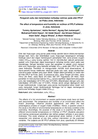 Tommy, Apriantono and Indria, Herman and Agung, Dwi Juniarsyah and Muhamad, Fahmi Hasan and Sri, Indah Ihsani and Iwa, Ikhwan Hidayat and Imam, Safei and Bagus, Winata and Ilham, Hin (2020) Pengaruh suhu dan kelembaban terhadap Vo2max pada atlet PPLP se-Pulau Jawa, Indonesia. Jurnal SPORTIF: Jurnal Penelitian Pembelajaran, 6 (1): 5. pp. 59-68. ISSN 2548 – 7833