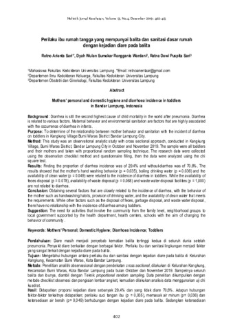 Retno, Arienta Sari and Dyah, Wulan Sumekar RengganisWardani and Ratna, Dewi Puspita Sari (2019) Perilaku ibu rumah tangga yang mempunyai balita dan sanitasi dasar rumah dengan kejadian diare pada balita. Holistik: Jurnal Kesehatan, 13 (4): 18. pp. 402-415. ISSN 1978-3337
