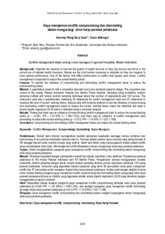 menggunakan program komputer. Hasil: Didapatkan bahwa terdapat pengaruh gaya manajemen konflik compromissing terhadap stres kerja perawat pelaksana (p=<0,001;PR = 1,33 95%CI 1,180-1,516), dan terdapat pengaruh gaya manajemen konflik dominating terhadap stress kerja perawat pelaksana (p=0,012;PR = 1,10 95%CI 1,021-1,189) Simpulan: Gaya manajemen konflik compromising dan dominating kepala ruangan berpengaruh dalam mengurangi stres kerja perawat pelaksana.