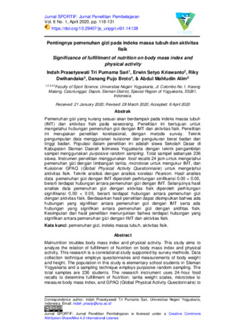 Indah Prasetyawati Tri Purnama Sari and Erwin Setyo Kriswanto (2020) Pentingnya pemenuhan gizi pada indeks massa tubuh dan aktivitas fisik. Jurnal SPORTIF: Jurnal Penelitian Pembelajaran, 6 (1): 10. pp. 118-131. ISSN 2548 – 7833