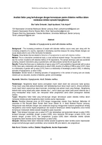 Eka Yudha, Chrisanto and Sapti, Ayubbana and Yola, Anjani (2020) Analisis faktor yang berhubungan dengan kemampuan pasien diabetes mellitus dalam melakukan deteksi episode hipoglikemia. Holistik: Jurnal Kesehatan, 14 (1): 2. pp. 8-16. ISSN 1978-3337