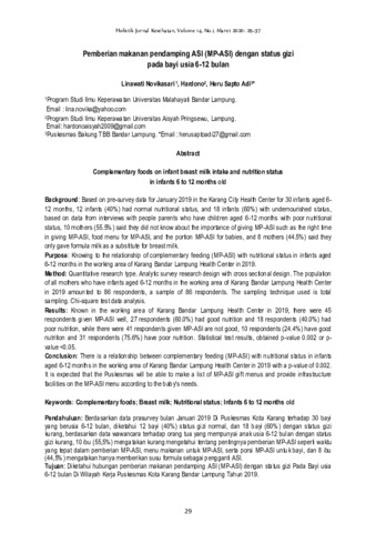 Linawati, Novikasari and Hardono, Hardono and Heru Sapto, Adi (2020) Pemberian makanan pendamping ASI (MP-ASI) dengan status gizi pada bayi usia 6-12 bulan. Holistik: Jurnal Kesehatan, 14 (1): 4. pp. 29-37. ISSN 1978-3337