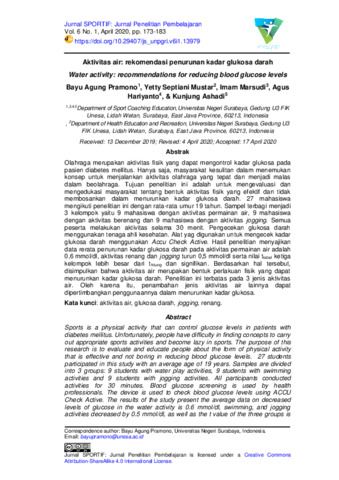 Bayu Agung Pramono and Yetty Septiani Mustar and Imam Marsudi and Agus Hariyanto and Kunjung Ashadi5 (2020) Aktivitas air: rekomendasi penurunan kadar glukosa darah. Jurnal SPORTIF: Jurnal Penelitian Pembelajaran, 6 (1): 14. pp. 173-183. ISSN 2548 – 7833