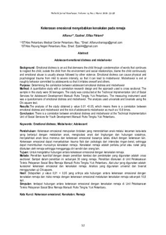 Alfianur, Alfianur and Ezalina, Ezalina and Elfiza, Fitriami (2010) Kekerasan emosional menyebabkan kenakalan pada remaja. Holistik: Jurnal Kesehatan, 14 (1): 7. pp. 52-58. ISSN 1978-3337