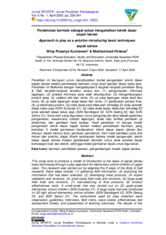Wing Prasetya Kurniawan and Mokhammad Firdaus (2020) Pendekatan bermain sebagai solusi mengenalkan teknik dasar sepak takraw. Jurnal SPORTIF: Jurnal Penelitian Pembelajaran, 6 (1): 18. pp. 226-241. ISSN 2548 – 7833