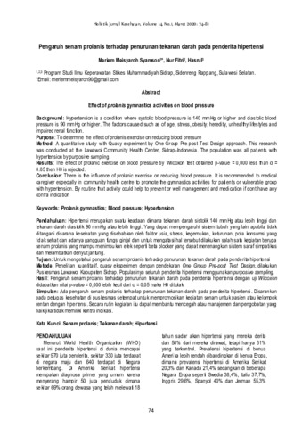 Meriem Meisyaroh, Syamson and Nur, Fitri and Hasrul, Hasrul (2020) Pengaruh senam prolanis terhadap penurunan tekanan darah pada penderita hipertensi. Holistik: Jurnal Kesehatan, 14 (1): 10. pp. 74-81. ISSN 1978-3337
