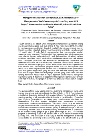Sugito Rendhitya Prima P and Muhammad Akbar Husein Allsabah and Rendhitya Prima Putra (2020) Pendekatan bermain sebagai solusi mengenalkan teknik dasar sepak takraw Manajemen kepelatihan klub renang Kota Kediri tahun 2019. Jurnal Penelitian Pembelajaran, 6 (1): 19. pp. 242-258. ISSN 2548 – 7833