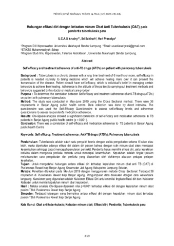U.C.A.S, Isnainy and Sri, Sakinah and Heri, Prasetya (2020) Hubungan efikasi diri dengan ketaatan minum Obat Anti Tuberkulosis (OAT) pada penderita tuberkulosis paru. Holistik: Jurnal Kesehatan, 14 (2): 8. pp. 219-225. ISSN 1978-3337
