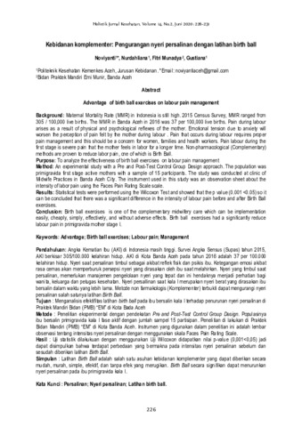 | Uncontrolled Keywords: | Persalinan; Nyeri persalinan; Latihan birth ball. |