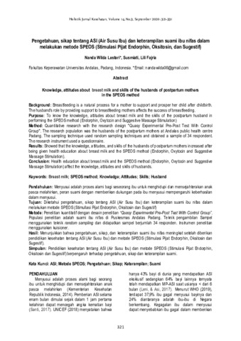 Nanda Wilda, Lestari and Susmiati, Susmiati and Lili, Fajria (2020) Pengetahuan, sikap tentang ASI (Air Susu Ibu) dan keterampilan suami ibu nifas dalam melakukan metode SPEOS (Stimulasi Pijat Endorphin, Oksitosin, dan Sugestif). Holistik: Jurnal Kesehatan, 14 (3): 1. pp. 321-331. ISSN 1978-3337