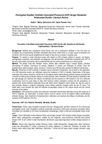 Solikin, Solikin and Matius Sakundarno, Adi and Septo Pawelas, Arso (2020) Pencegahan Kejadian Ventilator-Associated Pneumonia (VAP) dengan Kepatuhan Pelaksanaan Bundle: Literature Review. Holistik: Jurnal Kesehatan, 14 (3): 5. pp. 354-368. ISSN 1978-3337