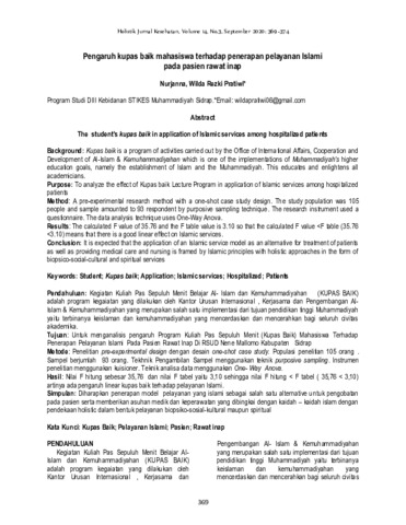 Nurjanna, Nurjanna and Wilda Rezki, Pratiwi (2020) Pengaruh kupas baik mahasiswa terhadap penerapan pelayanan Islami pada pasien rawat inap. Holistik: Jurnal Kesehatan, 14 (3): 6. pp. 369-374. ISSN 1978-3337