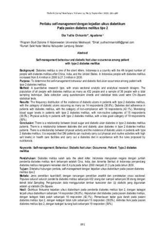 Eka Yudha Chrisanto and Agustama (2020) Perilaku self-management dengan kejadian ulkus diabetikum Pada pasien diabetes mellitus tipe 2. Holistik: Jurnal Kesehatan, 14 (3): 9. pp. 391-400. ISSN 1978-3337