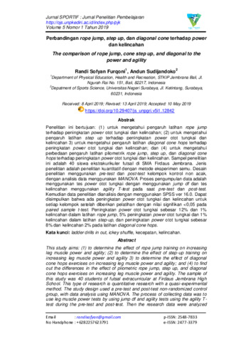 Randi Sofyan Furqoni and Andun Sudijandoko (2019) Perbandingan rope jump, step up, dan diagonal cone terhadap power dan kelincahan. Jurnal SPORTIF: Jurnal Penelitian Pembelajaran, 5 (1): 12. pp. 140-153. ISSN 2548 – 7833
