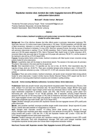 Mariawati, Mariawati and Khoidar, Amirus and Marliyana, Marliyana (2020) Kepatuhan menelan obat, merokok dan resiko kegagalan konversi (BTA positif) pada pasien tuberculosis. Holistik: Jurnal Kesehatan, 14 (4): 10. pp. 581-589. ISSN 1978-3337