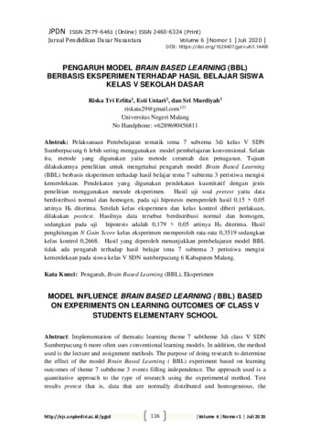 Riska Tri, Erlita and Esti, Untari and Sri, Murdiyah (2020) Pengaruh model Brain Based Learning (BBL) berbasis eksperimen terhadap hasil belajar siswa kelas V sekolah dasar. Jurnal Pendidikan Dasar Nusantara, 6 (1): 8. pp. 116-126. ISSN 2460-6324