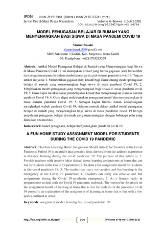 Slamet, Basuki (2020) Model penugasan belajar di rumah yang menyenangkan bagi siswa di masa pandemi COVID 19. Jurnal Pendidikan Dasar Nusantara, 6 (1): 15. pp. 199-210. ISSN 2460-6324