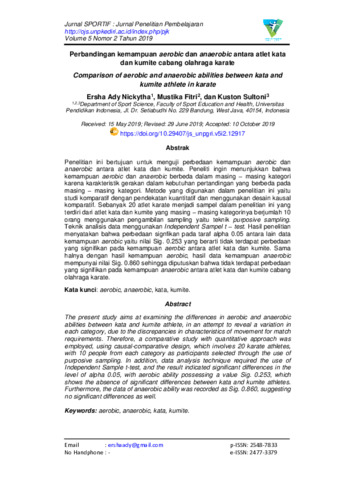 Ersha Ady Nickytha and Mustika Fitri and Kuston Sultoni (2019) Perbandingan kemampuan aerobic dan anaerobic antara atlet kata dan kumite cabang olahraga karate. Jurnal SPORTIF: Jurnal Penelitian Pembelajaran, 5 (2): 3. pp. 184-197. ISSN 2548 – 7833