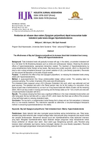 dan penyakit kardiovaskuler. Mencermati dampak buruk dari hiperkolesterolemia maka diperlukan intervensi yang tepat. Mengatasi hiperkolesterolemia dapat dilakukan dengan pengunaan terapi komplementer herbal berupa pemberian air rebusan daun salam. Daun salam juga mengandung quercetin, yaitu Flavonoid yang berperan dalam antioksidan kuat karena mampu mencegah oksidasi LDL (Low Density Lipoprotein). Flavonoid juga dapat mencegah pengendapan lemak pada dinding pembuluh darah. Tujuan: mengetahui pengaruh pemberian air rebusan dalam salam terhadap penurunan kadar kolesterol lanisa yang mengalami Hipercholesterolemia. Metode: penelitian quasy eksperimental dan menggunakan rancangan One Group pretest-posttest design without Control. Teknik pengambilan sampel dilakukan dengan secara purposive sampling. Jumlah sampel penelitiannya 29 partisipan. Kadar kolesterol pada partisipan diukur dengan menggunakan alat cek kolesterol GCU (Glukosa Colesterol Urid acid) yang sudah dikalibrasi dan memiliki akurasi yang baik. Uji statistic yang digunakan yakni uji Paired sample t-test. Adapun pembuatan ramuan daun salam pada setiap dosis pemberian dengan cara; rebus sebanyak 10 lembar daun salam dengan 400ml air hingga tersisa 200ml. 400 ml per hari berikan pagi dan sore dan terapi berlangsung selama 1 bulan penuh dan diakhiri dengan evaluasi pemeriksaan darah dengan GCU. Hasil: menunjukan bahwa ada perbedaan rerata kadar kolesterol yang bermakna sebelum dan sesudah diberikan rebusan daun salam dengan nilai p value 0,001 yang berarti ada pengaruh pemberian air rebusan daun salam terhadap penurunan kadar kolesterol. Simpulan: pemberian rebusan air daun salam merupakan terapi komplementer herbal yang murah, mudah, dapat dilakukan dimanapun dan kapanpun dan merupakan tindakan non-invasif. Intervensi ini diharapkan dapat