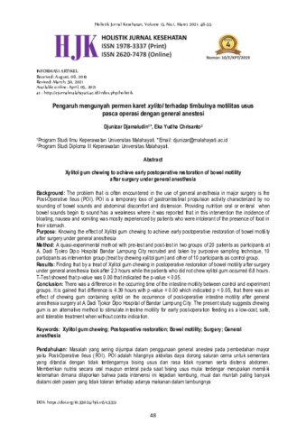 Djunizar, Djamaludin and Eka Yudha, Chrisanto (2021) Pengaruh mengunyah permen karet xylitol terhadap timbulnya motilitas usus pasca operasi dengan general anestesi. Holistik: Jurnal Kesehatan, 15 (1): 6. pp. 48-55. ISSN 1978-3337