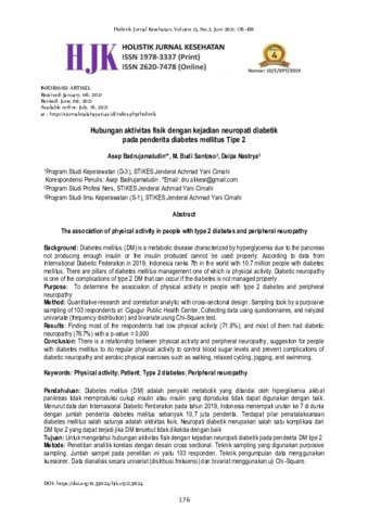 Asep, Badrujamaludin and M. Budi, Santoso and Deipa, Nastrya (2021) Hubungan aktivitas fisik dengan kejadian neuropati diabetik pada penderita diabetes mellitus Tipe 2. Holistik: Jurnal Kesehatan, 15 (2): 1. pp. 176-186. ISSN 1978-3337