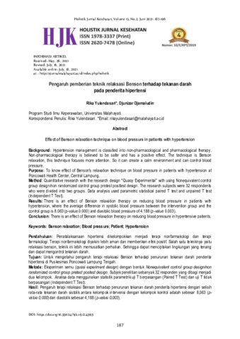 Rika, Yulendasari and Djunizar, Djamaludin (2021) Pengaruh pemberian teknik relaksasi Benson terhadap tekanan darah pada penderita hipertensi. Holistik: Jurnal Kesehatan, 15 (2): 2. pp. 187-196. ISSN 1978-3337