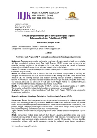 Idha, Farahdiba and Noviyani, Hartuti (2021) Evaluasi pengetahuan remaja dan partisipasinya pada kegiatan Pelayanan Kesehatan Peduli Remaja (PKPR). Holistik: Jurnal Kesehatan, 15 (2): 8. pp. 248-255. ISSN 1978-3337