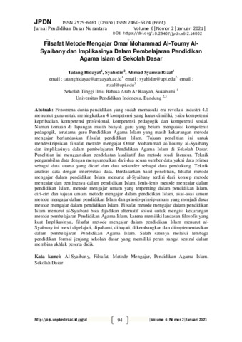 Tatang Hidayat and Syahidin Syahidin and Ahmad Syamsu Rizal (2021) Filsafat metode mengajar Omar Mohammad Al-Toumy Al-Syaibany dan implikasinya dalam pembelajaran pendidikan agama Islam di Sekolah Dasar. Jurnal Pendidikan Dasar Nusantara, 6 (2): 8. pp. 94-115. ISSN 2460-6324