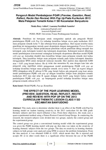 Ninda Beny, Asfuri and Luncana Faridhoh, Sasmito (2021) Pengaruh model pembelajaran PQ4R (Preview, Question, Read, Reflect, Recite dan Review) with pop up pada kurikulum 2013 mata pelajaran tematik Kelas V SD Kecamatan Banyudono. Jurnal Pendidikan Dasar Nusantara, 6 (2): 10. pp. 130-141. ISSN 2460-6324
