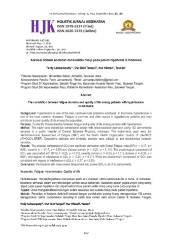 Ferdy, Lainsamputty and Dwi Debi, Tampa’i and Nur, Hikmah and Tasnim, Tasnim (2021) Korelasi domain kelelahan dan kualitas hidup pada pasien hipertensi di Indonesia. Holistik: Jurnal Kesehatan, 15 (3): 1. pp. 367-381. ISSN 1978-3337