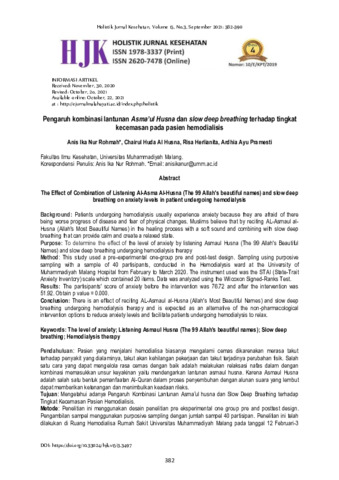 Anis Ika Nur, Rohmah and Chairul Huda, Al Husna and Risa, Herlianita and Ardhia Ayu, Pramesti (2021) Pengaruh kombinasi lantunan Asma’ul Husna dan slow deep breathing terhadap tingkat kecemasan pada pasien hemodialisis. Holistik: Jurnal Kesehatan, 15 (3): 2. pp. 382-390. ISSN 1978-3337