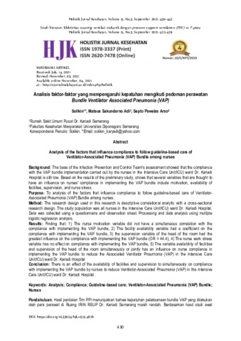 Solikin, Solikin and Mateus Sakundarno, Adi and Septo Pawelas, Arso (2021) Analisis faktor-faktor yang mempengaruhi kepatuhan mengikuti pedoman perawatan Bundle Ventilator Associated Pneumonia (VAP). Holistik: Jurnal Kesehatan, 15 (3): 7. pp. 430-442. ISSN 1978-3337