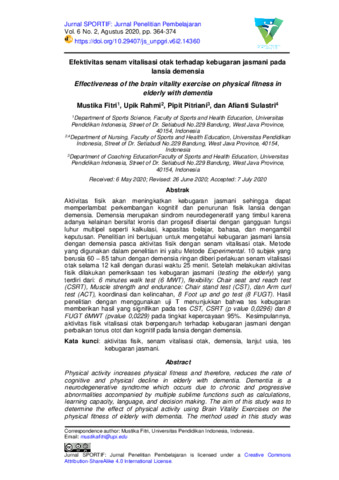Mustika Fitri and Upik Rahmi and Pipit Pitriani and Afianti Sulastri (2020) Efektivitas senam vitalisasi otak terhadap kebugaran jasmani pada lansia demensia. Jurnal SPORTIF: Jurnal Penelitian Pembelajaran, 6 (2): 6. pp. 364-374. ISSN 2548 – 7833