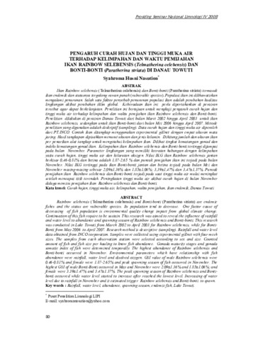 Ikan Rainbow selebensis (Telmatherina celebensis) dan Bonti-bonti (Paratherina striata) termasuk ikan endemik dan statusnya tergolong rawan punah (vulnerable species). Populasi ikan ini dikhawatirkan mengalami penurunan. Salah satu faktor penyebab penurunan populasi ikan adalah perubahan kualitas lingkungan akibat perubahan iklim global. Keberadaan ikan ini perlu dipertahankan di perairan tersebut agar dapat berkelanjutan. Penelitian ini bertujuan untuk mengkaji pengaruh curah hujan dan tinggi muka air terhadap kelimpahan dan waktu pemijahan ikan Rainbow selebensis dan Bonti-bonti. Penelitian dilakukan di perairan Danau Towuti dari bulan Maret 2002 hingga April 2003 untuk ikan Rainbow selebensis, sedangkan untuk ikan Bonti-bonti dari bulan Mei 2006 hingga April 2007. Metode penelitian yang digunakan adalah deskriptif (sampling). Data curah hujan dan tinggi muka air diperoleh dari PT.INCO. Contoh ikan ditangkap menggunakan experimental gillnet dengan empat ukuran mata jaring. Hasil tangkapan dipisahkan menurut ukuran dan jenis kelamin. Dihitung jumlah dan ukuran ikan per penarikan alat tangkap untuk mengetahui kelimpahan ikan. Dilihat tingkat kematangan gonad dan indeks kematangan gonad ikan. Kelimpahan ikan Rainbow selebensis dan Bonti-bonti tertinggi dijumpai pada bulan November. Parameter lingkungan yang memiliki keeratan hubungan dengan kelimpahan yaitu curah hujan, tinggi muka air dan kelarutan oksigen. Nilai IKG ikan Rainbow selebensis jantan berkisar 0,46-0,81% dan betina adalah 1,87-2,65 % dan puncak pemijahan ikan ini terjadi pada bulan November. Nilai IKG tertinggi pada ikan Bonti-bonti jantan dan betina terjadi pada bulan Mei dan November masing-masing sebesar 2,09±1,36% dan 1,85±1,06%; 3,39±1,47% dan 3,47±1,37%. Puncak pemijahan ikan Rainbow selebensis dan Bonti-bonti terjadi pada saat tinggi muka air mulai meningkat setelah mencapai titik terendah. Peningkatan tinggi muka air akibat curah hujan di bulan November diduga memicu pemijahan ikan Rainbow selebensis dan Bonti-bonti.