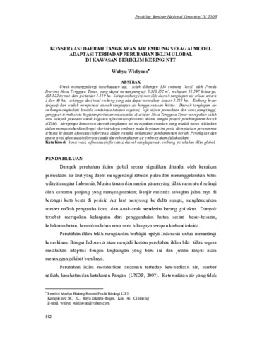 Wahyu Widiyono (2008) Konservasi daerah tangkapan air embung sebagai model adaptasi terhadap perubahan iklim global di kawasan beriklim kering NTT. In: Prosiding Seminar Nasional Limnologi IV, IPB International Convention Center, Bogor.