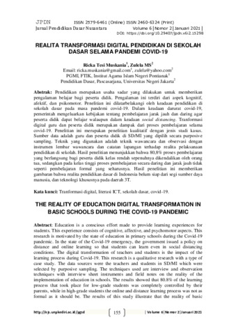 Ricka Tesi, Muskania and Zulela, MS (2021) Realita transformasi digital pendidikan di sekolah dasar selama pandemi Covid-19. Jurnal Pendidikan Dasar Nusantara, 6 (2): 12. pp. 155-165. ISSN 2460-6324