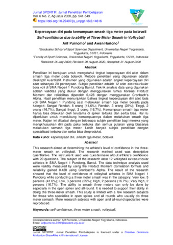 Arif Purnomo and Awan Hariono (2020) Kepercayaan diri pada kemampuan smash tiga meter pada bolavoli. Jurnal Penelitian Pembelajaran, 6 (2): 19. pp. 541-549. ISSN 2548 – 7833