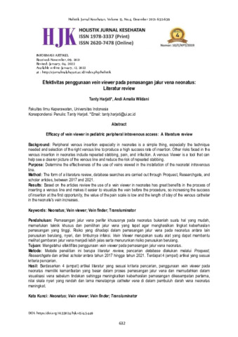 Tanty Harjati and Andi Amalia Wildani (2021) Efektivitas penggunaan vein viewer pada pemasangan jalur vena neonatus: Literatur review. Holistik: Jurnal Kesehatan, 15 (4): 7. pp. 632-639. ISSN 1978-3337