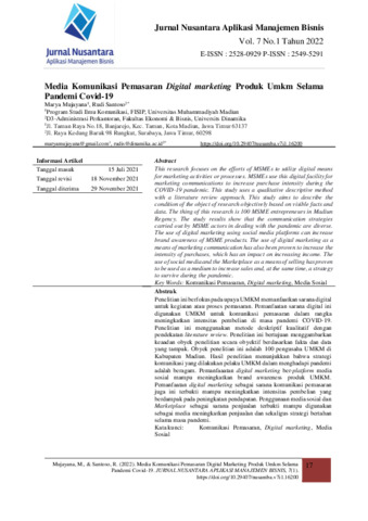 Marya, Mujayana and Rudi, Santoso (2022) Media komunikasi pemasaran digital marketing produk UMKM selama pandemi Covid-19. Jurnal Nusantara : Aplikasi Manajemen Bisnis, 1 (1): 2. pp. 17-30. ISSN 2549-5291