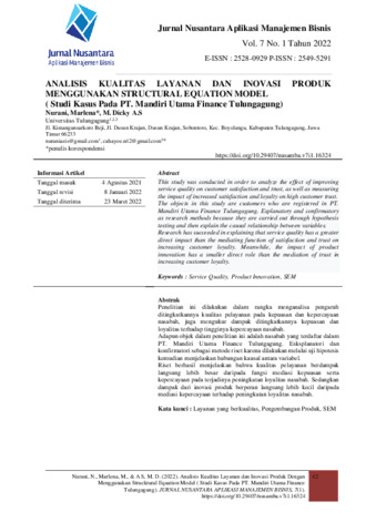 Nurani, Nurani and Marlena, Marlena and M.Dicky, A.S (2022) Analisis kualitas layanan dan inovasi produk menggunakan structural Equation Model (Studi kasus pada PT. Mandiri Utama Finance Tulungagung). Jurnal Nusantara : Aplikasi Manajemen Bisnis, 7 (1): 4. pp. 42-53. ISSN 2549-5291