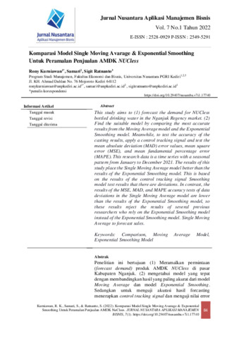 Penelitian ini bertujuan (1) Meramalkan permintaan (forecast demand) produk AMDK NUCless di pasar Kabupaten Nganjuk. (2) mengetahui model yang tepat dengan membandingkan hasil yang paling akurat dari model Moving Average dan model Exponential Smoothing. Sedangkan untuk menguji akurasi hasil forcasting menerapkan control tracking signal dan menguji nilai errormean absolutes deviation (MAD), mean square error (MSE), mean absolutes procentage error (MAPE). Data penelitian ini merupakan time series berpola musiman mulai Januari-Desember 2021.Hasil penelitian ini menempatkan model Single Moving Avarage lebih baik dari hasil model Exponential Smoothing. Ini berdasarkan hasil uji control tracking signal model Smoothing terdapat penyimpangan, sedangkan hasil uji akurasi MSE, MAD dan MAPE penyimpangan data pada model Single Moving Average lebih rendah dari hasil model Exponential Smoothing sehingga hasil ini menolak hasil beberapa peneliti sebelumnya yang mengandalkan model