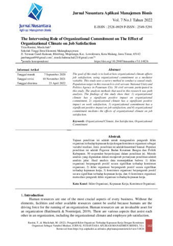 Titin, Rustini and Muslichah, Muslichah (2022) The Intervening role of organizational commitment on the effect of organizational climate on job satisfaction. Jurnal Nusantara : Aplikasi Manajemen Bisnis Vol. 7 No. 1 April 2022, 7 (1): 13. pp. 162-173. ISSN 2549-5291