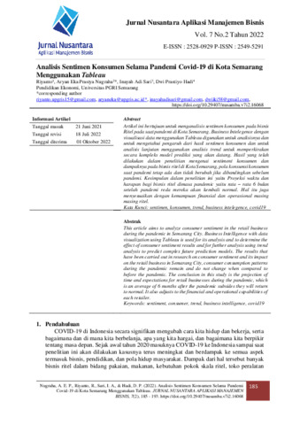 Riyanto, Riyanto and Aryan, Eka Prastya Nugraha and Inayah, Adi Sari and Dwi, Prastiyo Hadi (2022) Analisis sentimen konsumen selama pandemi Covid-19 di Kota Semarang menggunakan Tableau. Jurnal Nusantara : Aplikasi Manajemen Bisnis, 7 (2): 2. pp. 185-193. ISSN 2549-5291