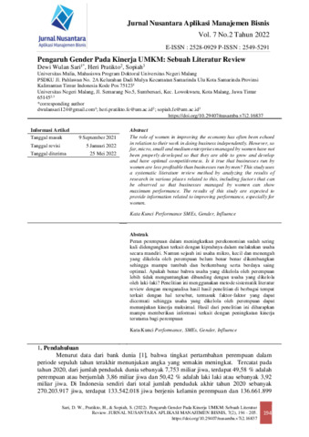 Dewi, Wulan Sari and Heri, Pratikto and Sopiah, Sopiah (2022) Pengaruh gender pada kinerja UMKM: sebuah literatur review. Jurnal Nusantara : Aplikasi Manajemen Bisnis, 7 (2): 3. pp. 194-205. ISSN 2549-5291