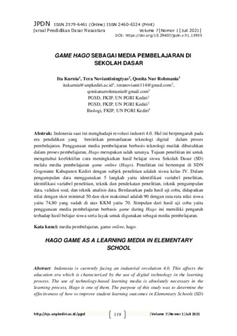 Ita, Kurnia and Tera, Noviantiningtyas and Qonita Nur, Rohmania (2021) Game Hago sebagai media pembelajaran di sekolah dasar. Jurnal Pendidikan Dasar Nusantara, 7 (1): 8. pp. 119-129. ISSN 2460-6324