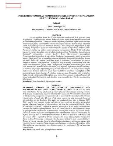 Sulastri, Sulastri (2011) Perubahan temporal komposisi dan kelimpahan fitoplankton di Situ Lembang, Jawa Barat. Limnotek : Perairan Darat Tropis di Indonesia, 18 (1). pp. 1-14. ISSN 2549-8029