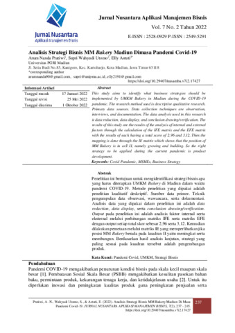 Arum, Nanda Pratiw and Supri, Wahyudi Utomo and Elly, Astuti (2022) Analisis strategi bisnis MM Bakery Madiun dimasa pandemi Covid-19. Jurnal Nusantara : Aplikasi Manajemen Bisnis, 7 (2): 6. pp. 237-245. ISSN 2549-5291