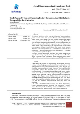 Jovan, Jovan and Ronald, Ronald (2022) The Influence of content marketing factors towards actual visit behavior through behavioral intention. Jurnal Nusantara : Aplikasi Manajemen Bisnis, 7 (2): 5. pp. 225-236. ISSN 2549-5291
